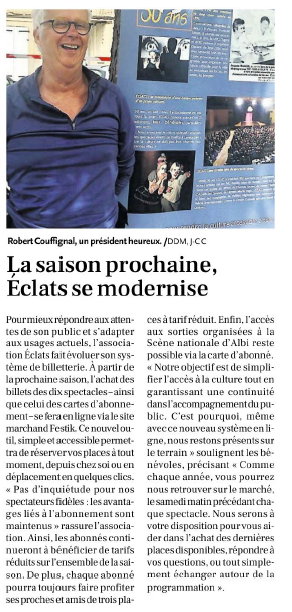 La saison prochaine, Éclats se modernise. Son système de billetterie évolue ; les places de nos dix futurs spectacles ainsi que les cartes d’abonnés seront désormais en vente sur le site « Festik ».